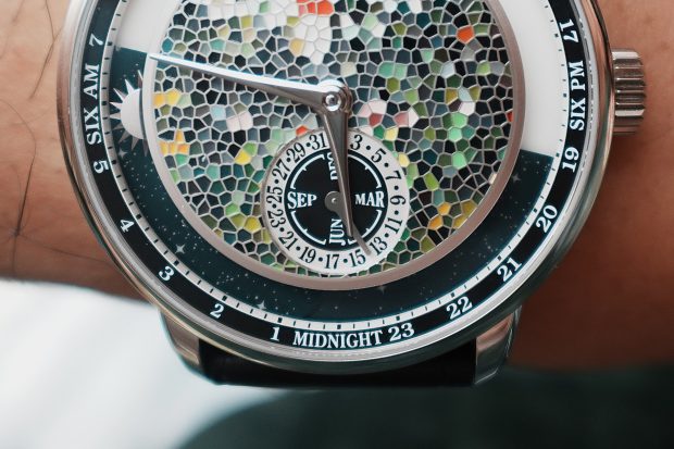 Throughout the day, a hand-finished sun gradually makes its way along light and dark sectors that Maillat engineered to indicate day and night anywhere on Earth. His C030 movement also displays the date and month on a small subdial at the 6 o’clock position.