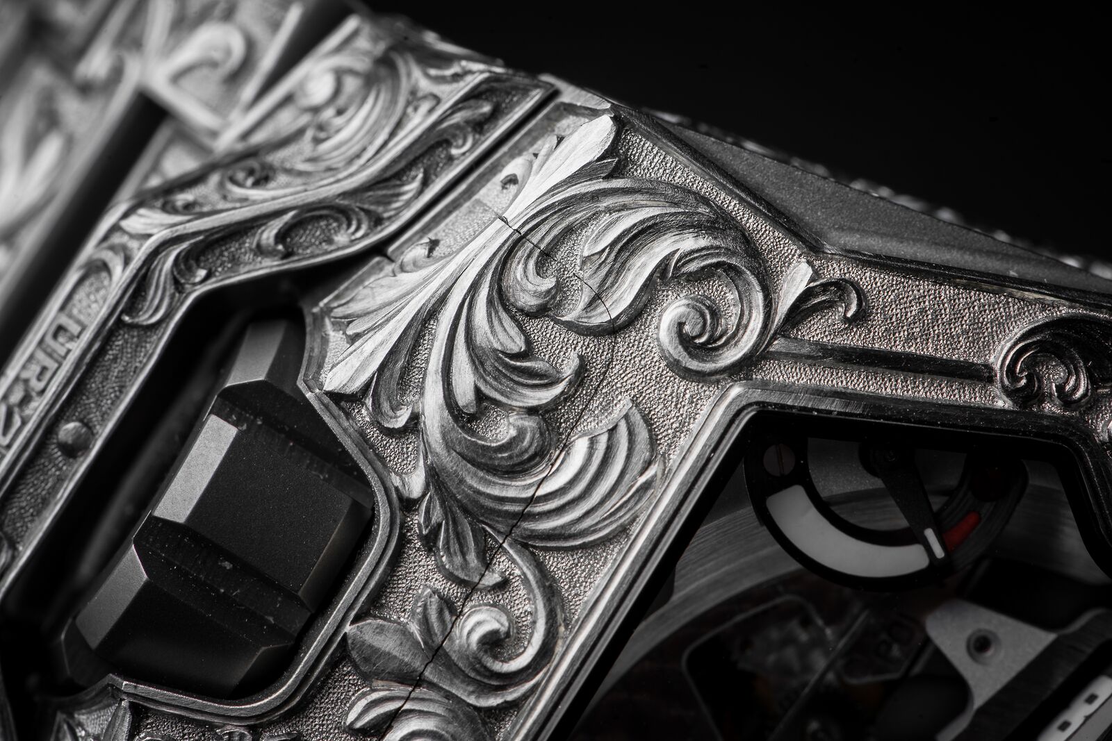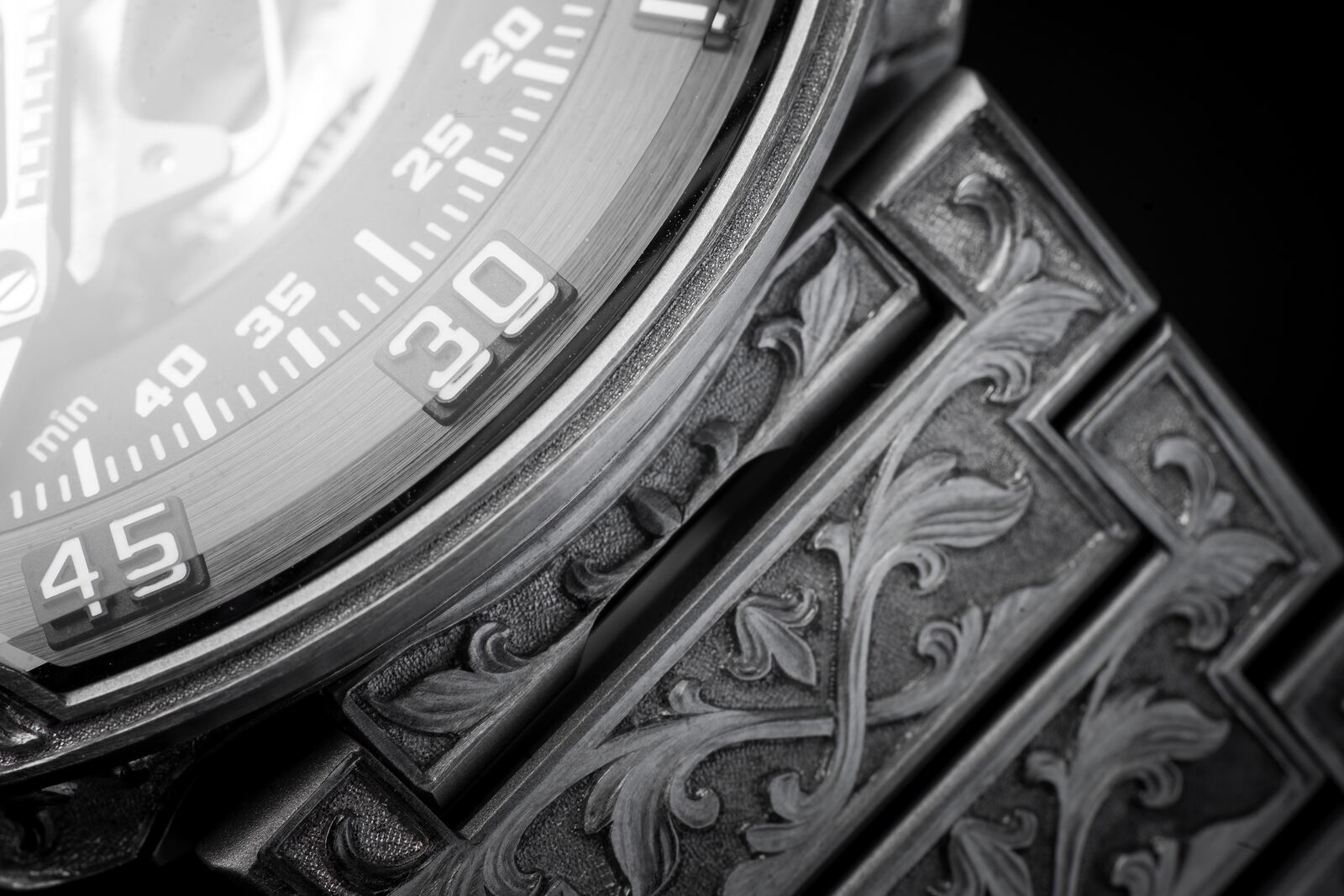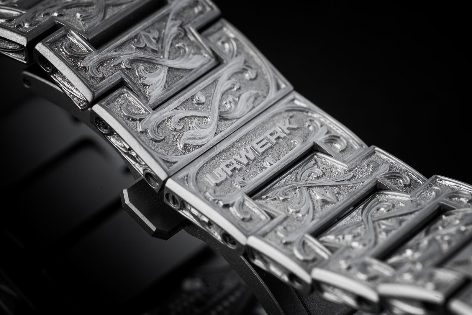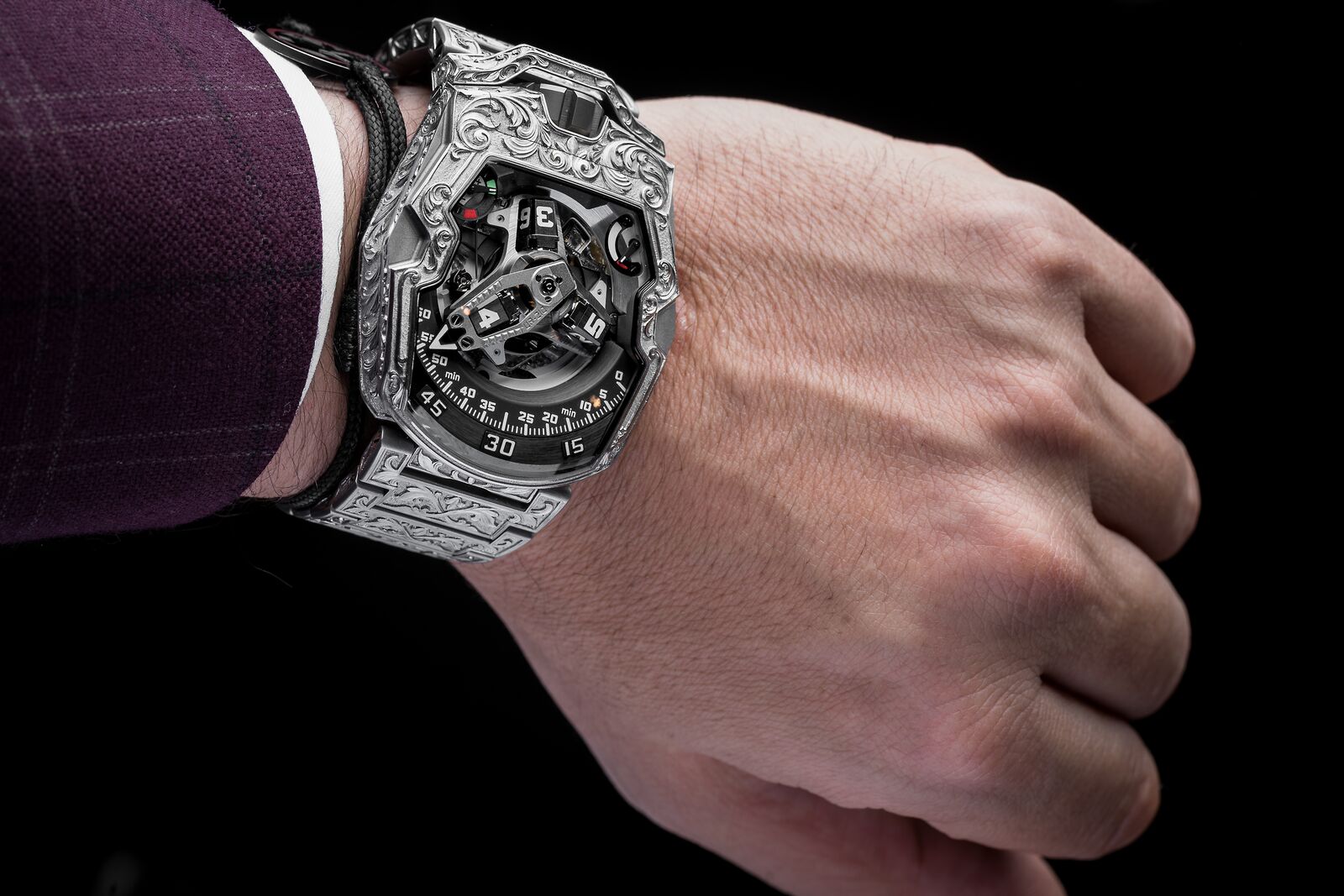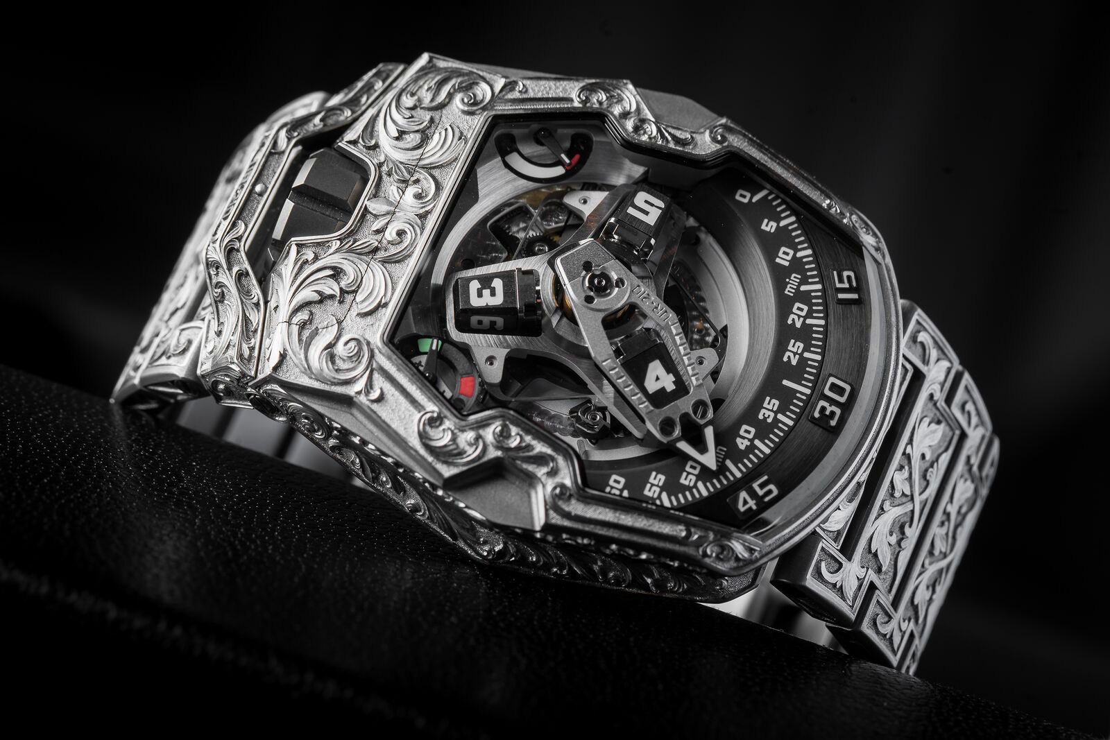 It took him no less than 260 hours in which he completely transformed the UR-210. His challenge was not only the material, as steel is one of the most difficult metals to engrave, but also the motive. This motive floats seamlessly from the case and crown protector onto the bracelet in unparalleled precision. Although all done by hand, the symmetry is perfect, and the engravings almost seem to hold the movement and wrap on the arm of the wearer like an ivy. It makes this piece unique not only a fitting tribute to the anniversary of Urwerk but also to the past, present and future of watchmaking!
