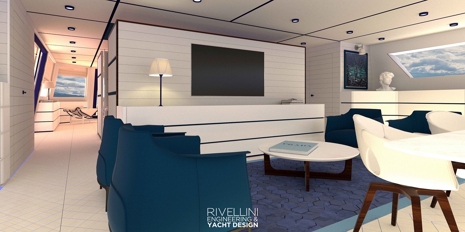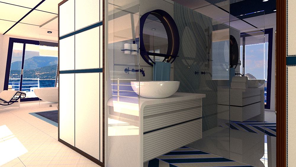 One of the many innovative features is the extendable stern that can be expanded and opened to a larger space that serves as a sunbathing area, outdoor gym and relaxation area with chaise-lounges on the other side of the yacht. From this deck, guests can directly access the beach are and enjoy the waters. While an expandable deck isn’t entirely a new concept in the world of yachting, Extended Explorer does a phenomenal job. For the interiors, Rivellini proposed envisages a super-panoramic owner’s suite that occupies the entire Upper Deck from which the surrounding landscape and, without any visual interruption and a dedicated deck to enjoy open-air aperitifs. Inspired by the marine environment, Extended Explorer features nubuck leather fabrics in blue shades and white lacquer.