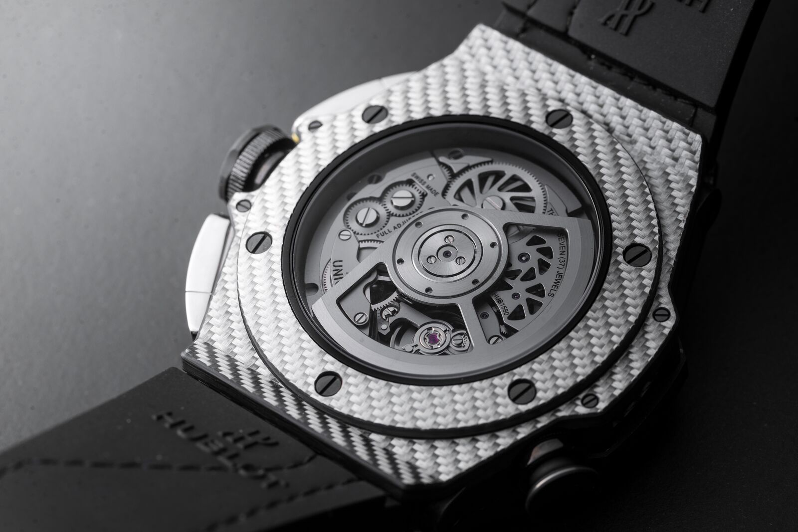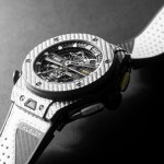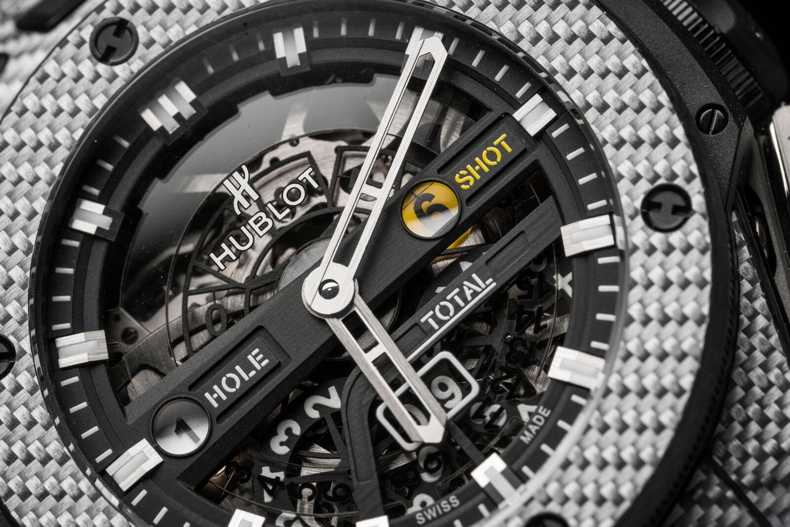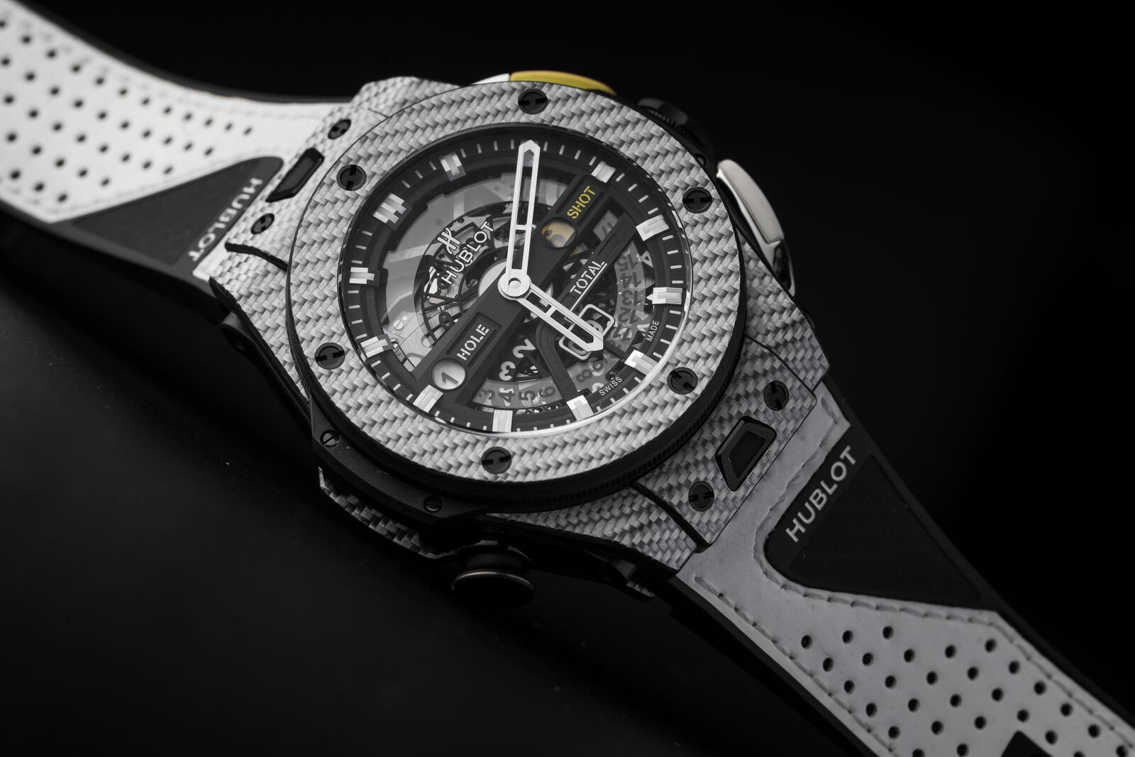 The Big Bang Unico Golf features a case made from Texalium. This is a material exclusive to Hublot and combines aluminium with carbon fibre. This not only keeps the watch very light, despite its diameter of 45mm but also makes it very strong. The whole watch weights only 98 grams. This is achieved by making no compromises because the Big Bang Unico Golf is even water resistant to 100 meters.