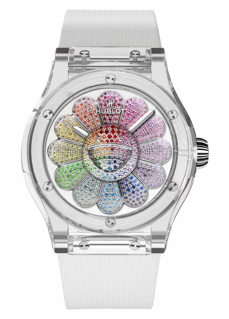 As the name already indicates is the 45mm large case of this Classic Fusion made from transparent sapphire crystal. This gives the dial center stage, featuring a smiling flower with colorful petals that rotate around the center. Crafted with great attention to detail, the entire flower is set with gemstones in all the colors of the rainbow. Hublot needed 384 of them for a single watch, and they created a mesmerizing effect, bringing the work of Murakami to life in a most dazzling way. In a way is this timepiece also a mystery watch, as the hands come from under the smiling center of the flower, but above the petals, with no sign of the movement that is powering this creation.