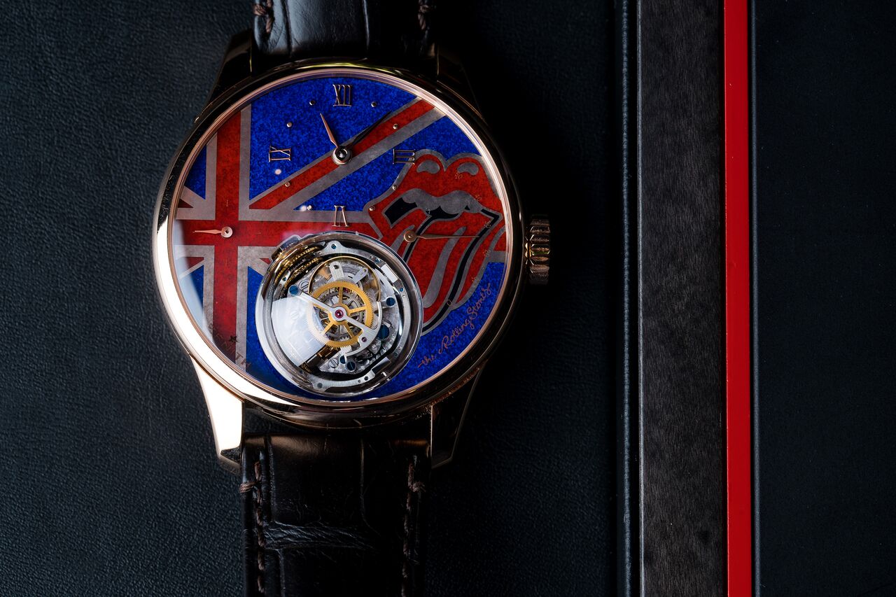 It is a very expressive watch that combines an 18K rose gold case housing the movement with its “zero-gravity” regulation system with a dial featuring part of the British Flag and the famous Rolling Stones tongue. The dial is an enamel painting with beautiful details and vibrant colors. A fitting tribute to one of the pioneering rock groups.