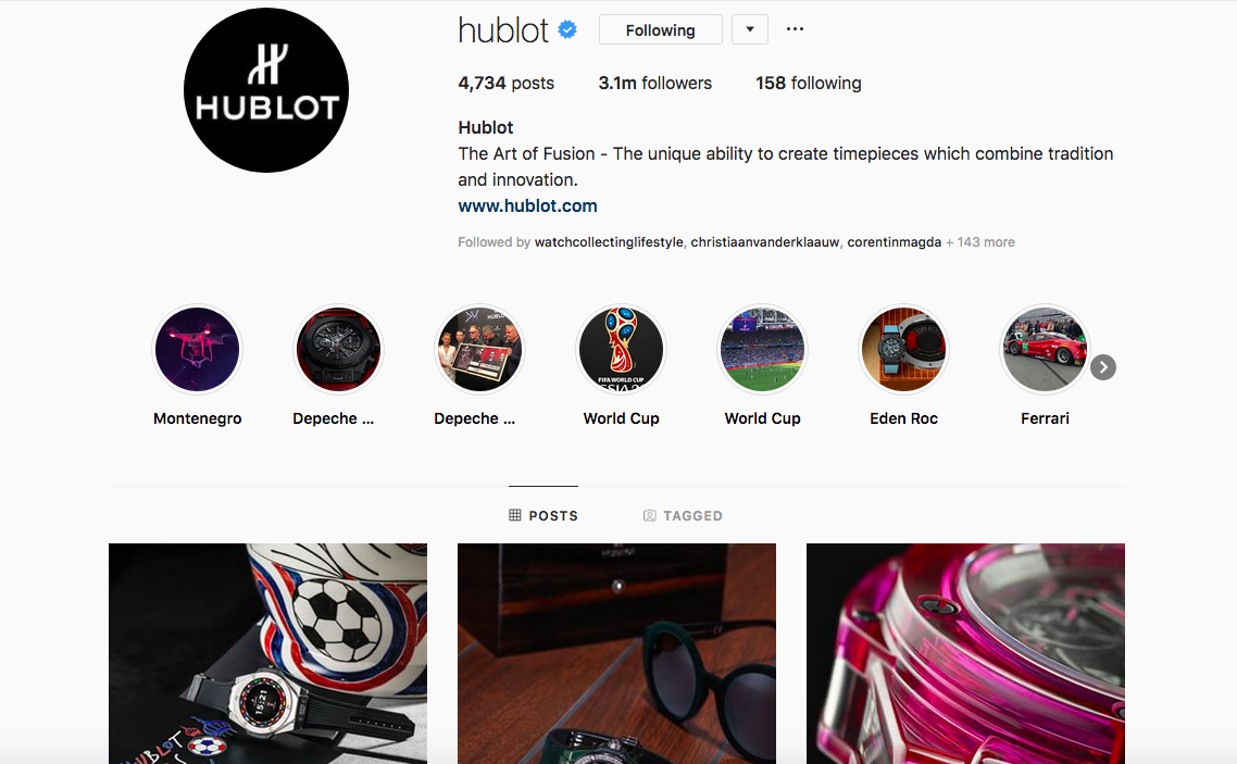 Hublot offers a full emerging into their universe through their Instagram account. They not only highlight their latest models but also allow you to have a front row seat at many of their events through Instagram stories. This combination and their regular updates have made it one of the most successful Instagram account among watch brands with a staggering 3.1 million(!) followers!
