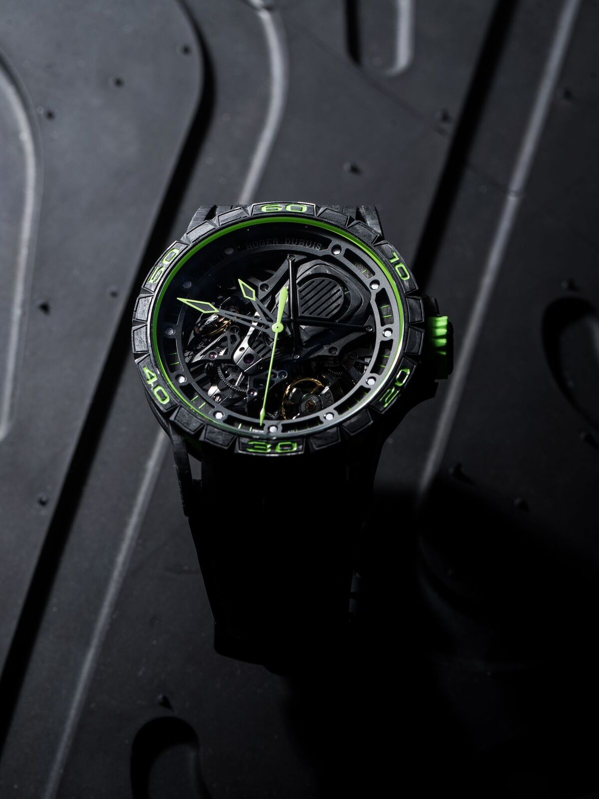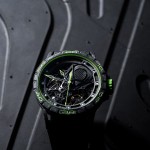 In that way, this Roger Dubuis is rather similar to the car that gave its name, the Lamborghini Aventador S. Yet this is not the only similarity between the two mechanical marvels. Just like Lamborghini has also Roger Dubuis embraced new materials to make its watched lighter yet stronger. Just as the chassis of the Aventador S is also the case of the Roger Dubuis made from C‑SMC carbon. Weight is even further reduced by skeletonizing the case where possible, and that makes it that it wears surprisingly light despite its generous diameter of 45mm.